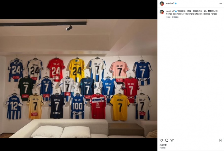 01月20日讯 武磊今日更新了个人ins,晒出了西班牙人球衣墙。